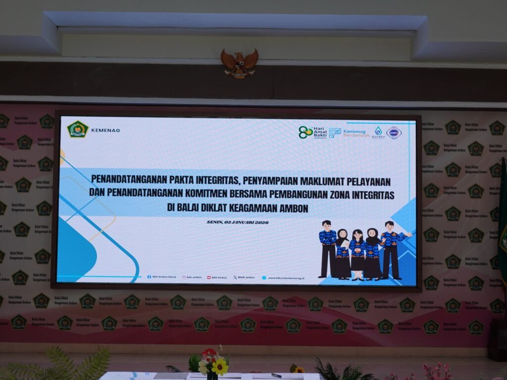 Ambon , 05 Januari 2026 ,  Dalam rangka memperkuat budaya kerja berintegritas dan mewujudkan tata kelola pemerintahan yang bersih, Balai Diklat Keagamaan (BDK) Ambon melaksanakan rangkaian kegiatan penguatan integritas bertempat di Aula BDK Ambon.